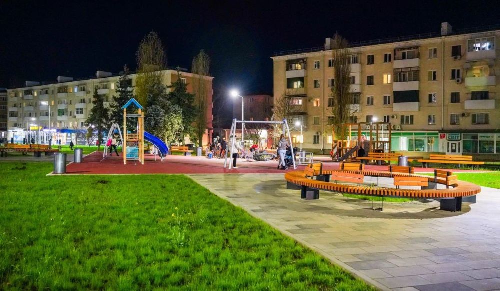 Это:4 детские площадки, 2 спортивные площадки, свыше 1000 новых скамеек и урн, почти 420 опор освещения со светодиодными светильниками, более 500 парковочных мест, 100 тысяч кв.м газона