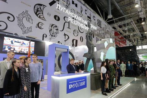 Фото: Луганский информационный центр Посетители Международной выставки-форума "Россия" на ВДНХ в Москве охотно фотографируются на фоне луганской экспозиции, в центре которой памятник "Т