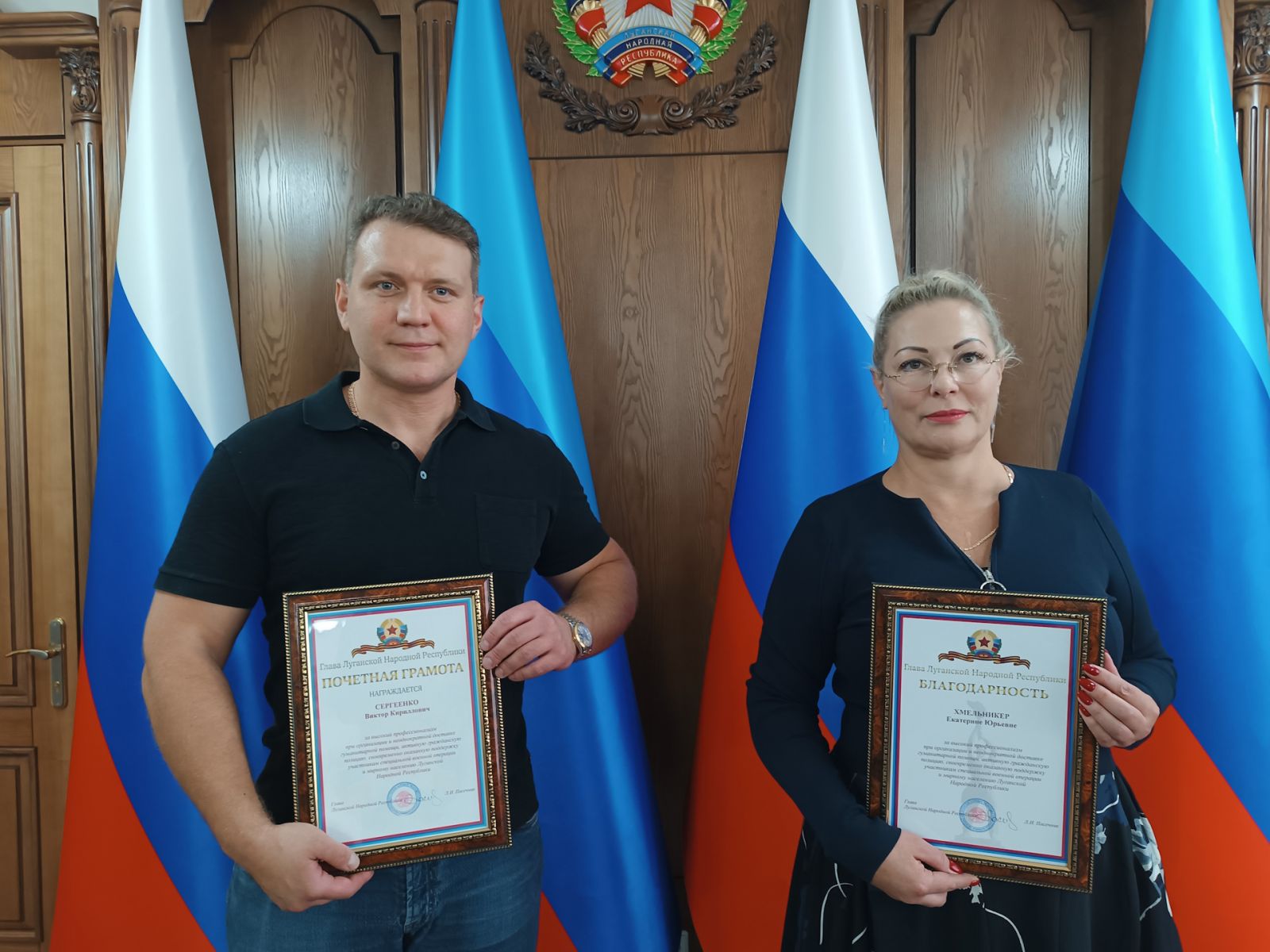 "Распоряжением Глав Луганской Народной Республики за высокий профессионализм при организации неоднократной доставки гуманитарной помощи, активную гражданскую позицию, своевременно оказанную поддержку участникам Специальной военной операции и мирному населению Луганской Народной Республики награжден почетной грамотой Главы Луганской Народной Республики Сергиенко Виктор Кириллович. Объявлена благодарность Главы Луганской Народной Республики Хмельникер Екатерине Юрьевне", – было отмечено в ходе церемонии награждения.