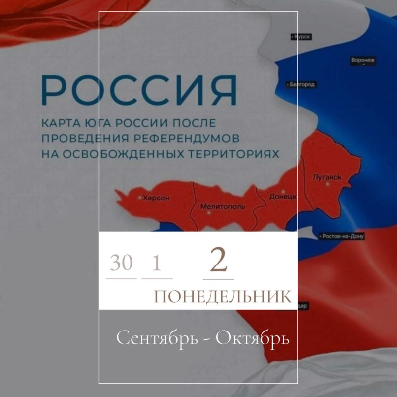 30 сентября 2022 года в состав Российской Федерации вернулись четыре южных региона — Луганская и Донецкая народные республики, а также Херсонская и Запорожская области.