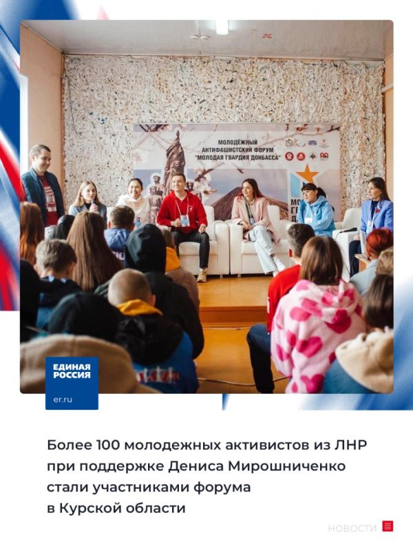 120 молодежных активистов из ЛНР приняли участие в Молодежном антифашистском форуме «Молодая гвардия Донбасса», который прошел на базе детского оздоровительного лагеря «Солнышко» Солнцевского района Курской области. Поддержку в организации поездки им оказал Секретарь Луганского регионального отделения партии «Единая Россия», Председатель Народного Совета ЛНР Денис Мирошниченко.