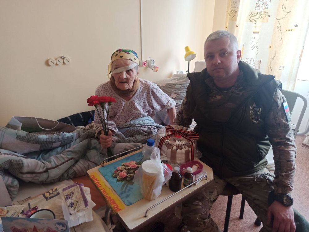 Ветеран Великой Отечественной войны Евдокия Родионова живет в Луганске в пансионате для ветеранов войны. Сама она инвалид, у нее нет ноги и глаза и ей уже 98 лет, но она держится молодцом, всегда бодра и весела.