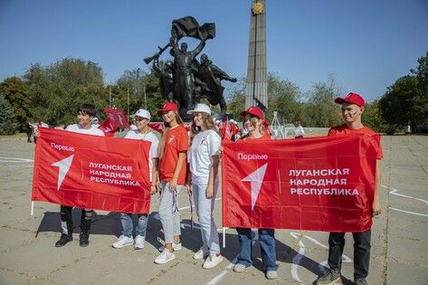 Активисты Луганского регионального отделения Российского движения детей и молодежи (РДДМ) "Движение первых" провели флешмоб в честь Дня воссоединения ЛНР, ДНР, Запорожской и Херсонской областей с Россией.