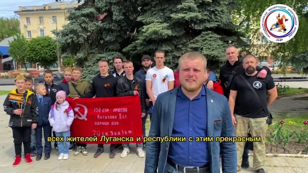 Активисты Республиканской Федерации спортивной борьбы ЛНР 9 Мая также раздали жителям города Луганска георгиевские ленто