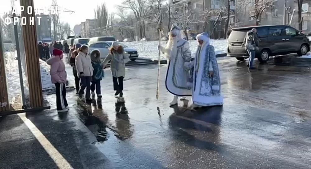 Анна Еременко, РУК РИК Народного Фронта ЛНР и Василий Леонов, депутат Народного Совета ЛНР, в костюмах Снегурочки и Деда Мороза приехали поздравить детей в отремонтированный парк Щорса в Луганске Реко