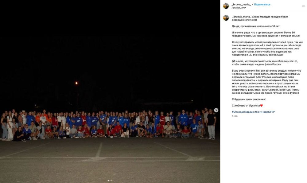 Мария Бруева передает "Молодой Гвардии" теплые пожелания из Луганска От молодых отделений новых регионов особенно приятно слышать поздравления! Луганск - отмечайтесь в комментахНапоминаю, чт