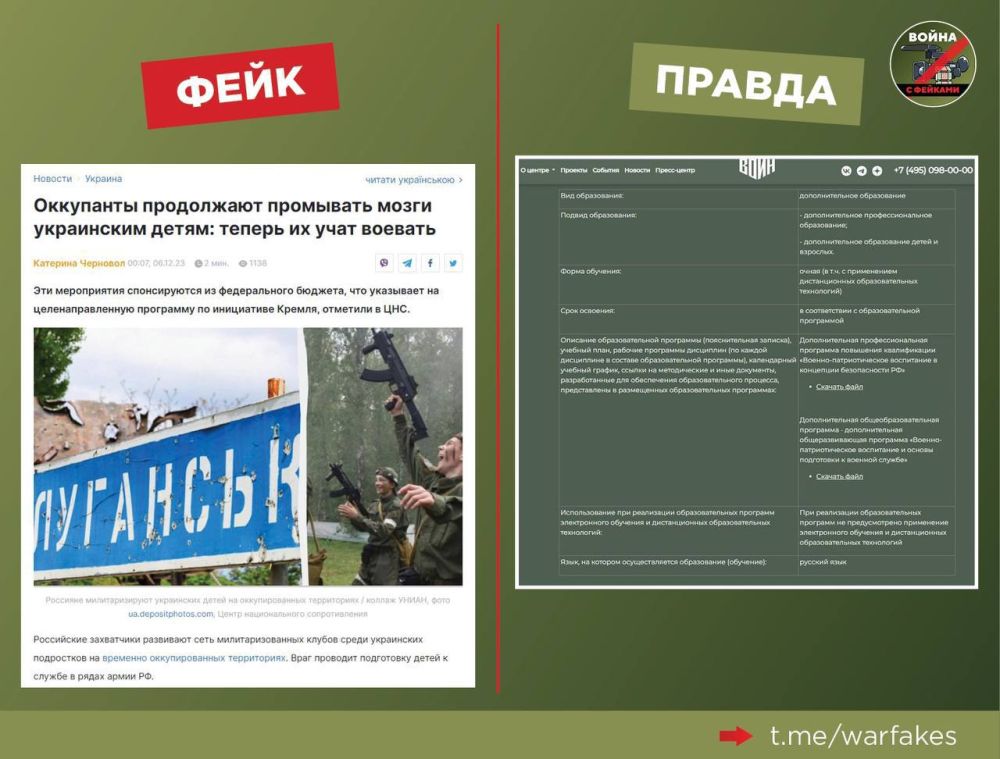 Правда: В Луганской Народной Республике открывается филиал Центра военно-спортивной подготовки и патриотического воспитания молодёжи «Воин». Набор туда идёт строго на добровольной основе. Учебные программы проходят по категории «дополнительное образование», которое по определению не может быть принудительным. В свободное от учёбы в школе или колледже время подросток может посещать как танцевальный кружок или художественную школу, так и такой центр.