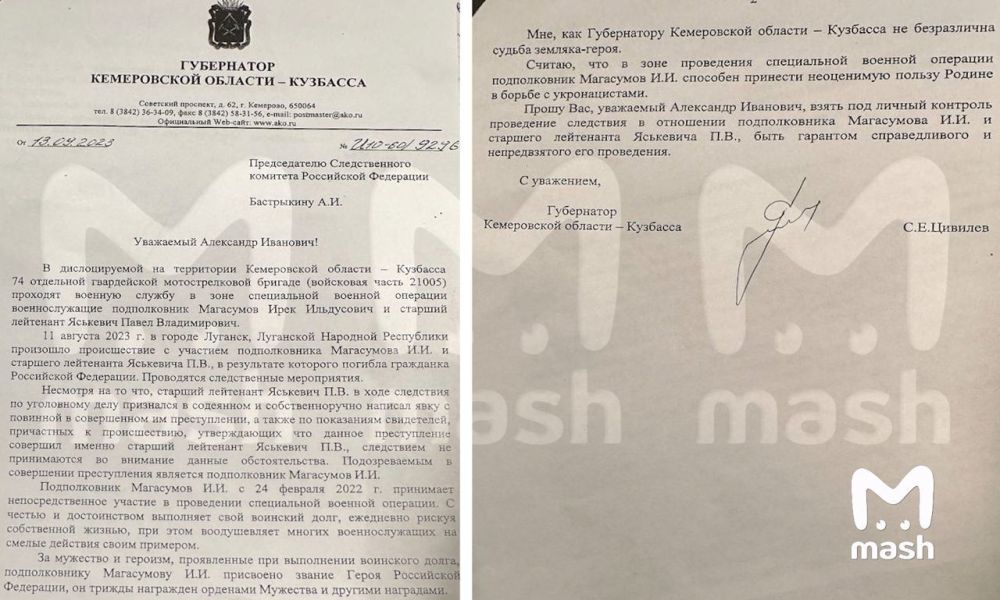 Вторая — версия следствия, которую нам подтвердили в СКР. По ней случилось примерно то же самое. Только вот подполковник никуда не уезжал. И, несмотря на эмоциональное письмо от губернатора Кузбасса Цивилёва (на фото) и все заслуги Магасумова, доказательства есть доказательства — Яськевич непричастен, а выстрелил, даже если случайно, именно Ирек, находясь в состоянии алкогольного опьянения. Поэтому 16 сентября ему предъявили обвинение.