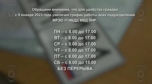«Обращаем внимание, что для удобства граждан с 9 января 2023 года увеличен график работы всех подразделений МРЭО УГИБДД МВД ЛНР», – говорится в сообщении Центра общественных связей правоохранительного ведомства.