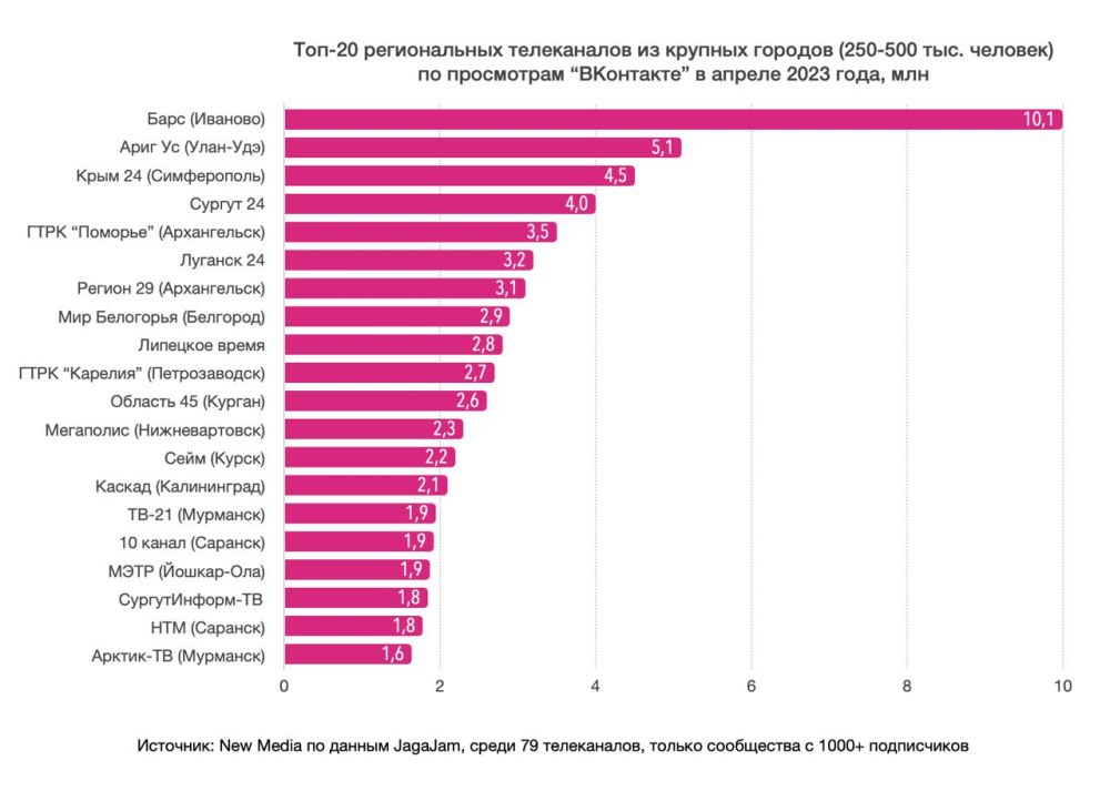 Официальная группа телеканала «Луганск 24» в социальной сети «ВКонтакте» заняла лидирующие позиции в рейтинге по подписчикам и просмотрам за апрель 2023 года среди региональных телеканалов из крупных городов России. Об этом со ссылкой на данные своего исследования сообщает Telegram-канал New Media.