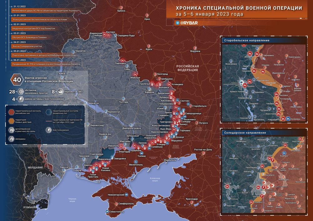 Хроника специальной военной операции за 5-6 января 2023 года Республика Крым:В четверг ВСУ, используя БЛА, попытались атаковать аэродром Бельбек в Севастополе, однако средства ПВО сбили все цели