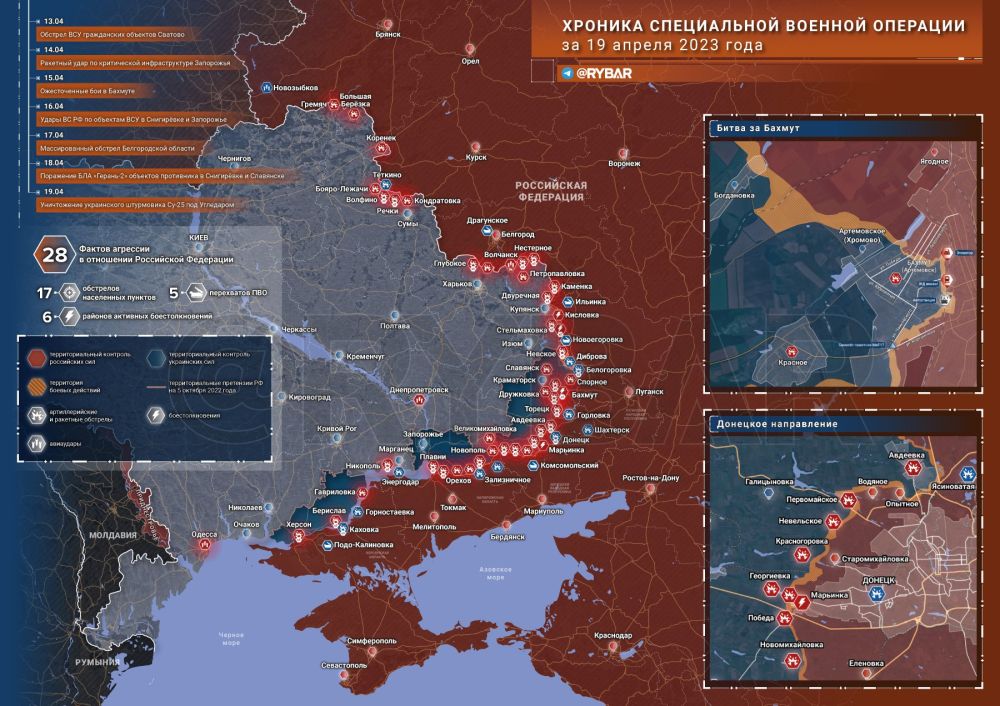 Хроника специальной военной операции за 19 апреля 2023 годаБелгородская область:Украинский беспилотник пытался атаковать электростанцию в селе Драгунское, однако был уничтожен сразу после обнаружения