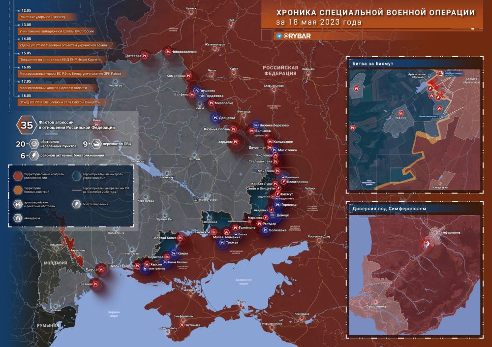 Хроника специальной военной операции за 18 мая 2023 годаУкраинские диверсанты в Крыму подорвали железнодорожные пути в районе села Чистенькое, пустив под откос больше десятка товарных вагонов