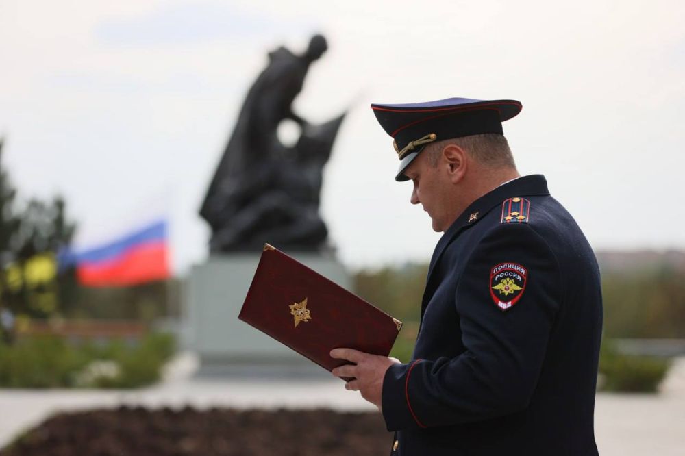 Торжественная церемония состоялась у мемориального комплекса "Острая могила". Клятву на верность России произнесли руководители отделов МВД, а также заместители министра внутренних дел по ЛНР.