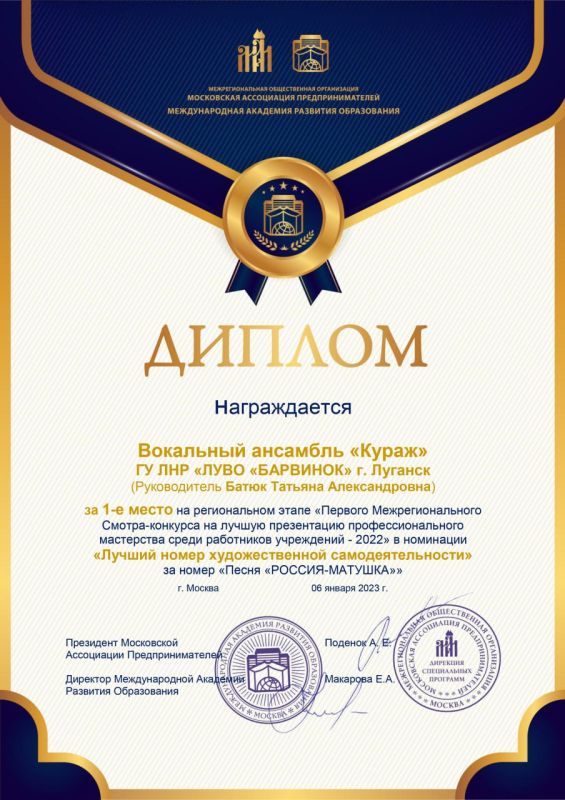 Там уточнили, что руководитель вокального ансамбля «Кураж» Луганского учебно-воспитательного объединения «Барвинок» Татьяна Батюк одержала победу в номинации «Лучший номер художественной самодеятельности».