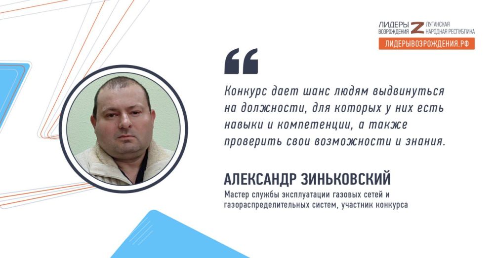 Мастер службы эксплуатации газовых сетей и газораспределительных систем Александр Зиньковский рассказал о своем решении принять участие в кадровом конкурсе «Лидеры возрождения. Луганская Народная Республика»: «Проект заинтересовал тем, что ничего подобного не проводилось в нашем регионе никогда. Он дает шанс людям выдвинуться на должности, для которых у них есть навыки и компетенции, а также проверить свои возможности и знания».