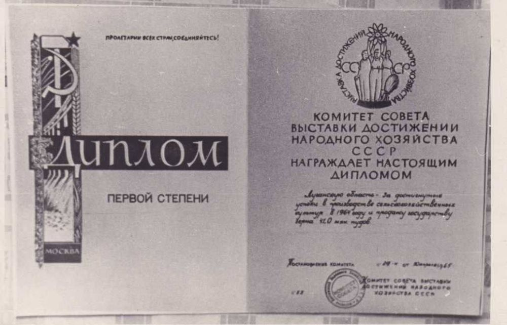 Как рассказала руководитель Архивной службы ЛНР Анна Тодорова, в советское время, Луганская область неоднократно завоевывала наградады за участие во всесоюзных выставках. Так в 1965 году регион получил Диплом ВДНХ СССР первой степени в Москве.