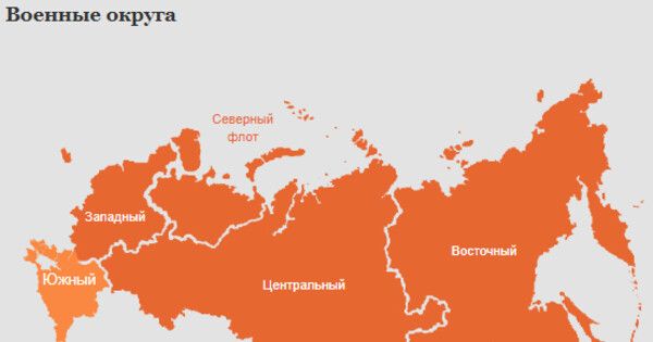 Всего в России четыре военных округа (Южный, Западный, Центральный, Восточный) и Объединенное стратегическое командование «Северный флот».