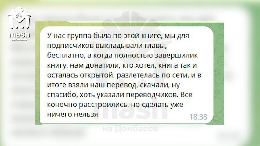По их словам, это был коллективный труд, который им никто не заказывал. Они переводили по главе из книги, выкладывали в интернет и собирали донаты благодарных читателей. В какой-то момент роман был полностью переведён, а чуть позже переводчики узнали, что их текст опубликован. Никто не связывался с ними, никто не спрашивал их разрешения на публикацию. Мы также сходили на рынок в Москве, где продаются книги, — там нам наотрез отказались поведать, где они взяли чтиво.
