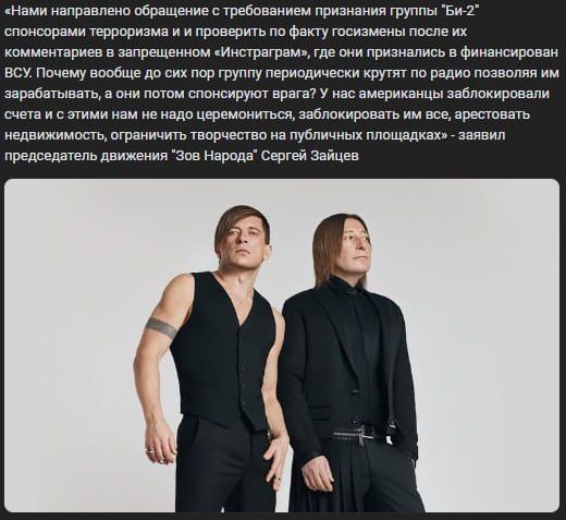 Всё из-за постов лидера группы — Егор «Лёва» Бортник публично заявлял о помощи Украине и о покупке техники для ВСУ. Активисты также требуют изъять всё творчество группы из публичного доступа и направили обращение в Генпрокуратуру, СК и Минкульт.