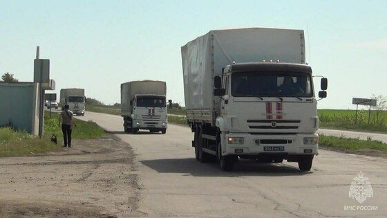 "15 мая автомобили очередного конвоя МЧС России с помощью для жителей Донбасса прибыли в столицу ЛНР. Из Луганска машины сразу отбыли в Рубежное, Северодонецк. Нынешний конвой российских спасателей, состоящий из 17 автомобилей, доставил продукты питания общим весом 190 тонн", - говорится в сообщении.