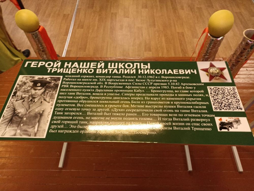 11 декабря совместно с заместителем председателя Совета городского округа города Луганска Луганской Народной Республики, координатором проекта "Парта Героя" Вероникой Бовой а стенах ГУ ЛНР "Луганский учебно - воспитательный комплекс 31" принял участие в торжественном открытии двух парт, посвященных памяти выпускников школы, воинов - интернационалистов. Лучшие обучающиеся школы будут сидеть за "Партами Героя" Трищенко Виталия Николаевича и Клепакова Владимира Владимировича, которые погибли исполняя свой воинский долг в республике Афганистан.