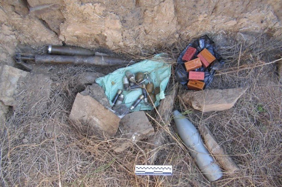 «Обнаружены автомат АК-74, 1 675 патронов калибра 5,45 мм, 6 патронов калибра 7,62 мм, 3 гранаты РГД-5, граната Ф-1, 3 запала УЗРГМ, 4 штуки ВОГ-17, 4 штуки ВОГ-25, 2 выстрела к СПГ-9, 2 снаряда калибром 122 мм и 125 мм, 6 противотанковых мин ТМ-62, 6 взрывателей МВЧ-62, 3 тротиловые шашки по 400 граммов, 3 тротиловые шашки по 200 граммов, СВУ из ВОГ-17 и УЗРГМ», — сказано в сообщении.