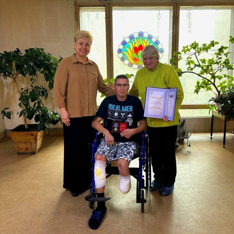 Сейчас парень находится на лечении в госпитале Бурденко. Очень хотелось не просто навестить парня с гостинцами. Считаю, что необходимо для наших военнослужащих делать большее. Поэтому нашли контакты матери бойца и организовали им встречу. От имени Главы ЛНР вручила медаль «За боевые заслуги», а его маме, Надежде Григорьевне, Благодарственное письмо.
