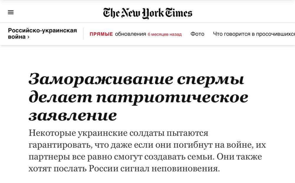 Попалась на глаза забавная новость:Издание NYT разместило на своих страничках материал о том, что украинские военные замораживают свою сперму не только для того, что бы оставить после себя себя потомс