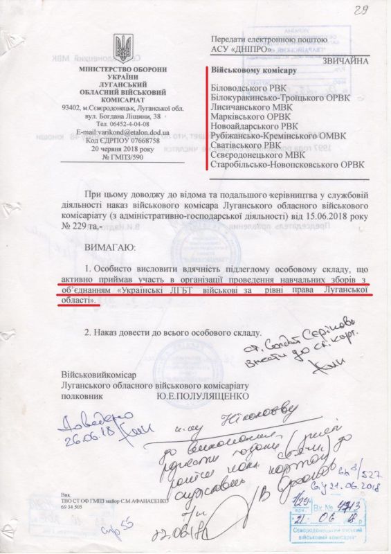 На первом фото указание от 2018 года, разосланное по всем военкоматам подконтрольной на тот момент Киеву части Луганской области. Циркуляром пришла команда военным комиссарам «лично выразить благодарность подчиненному личному составу, который активно принимал участие в организации проведения учебных сборов «Украинские ЛГБТ военнослужащие за равные права Луганской области». Еще раз. Такие «учебные сборы» проводились по команде, а самые активные участники поощрялись по распоряжению сверху.