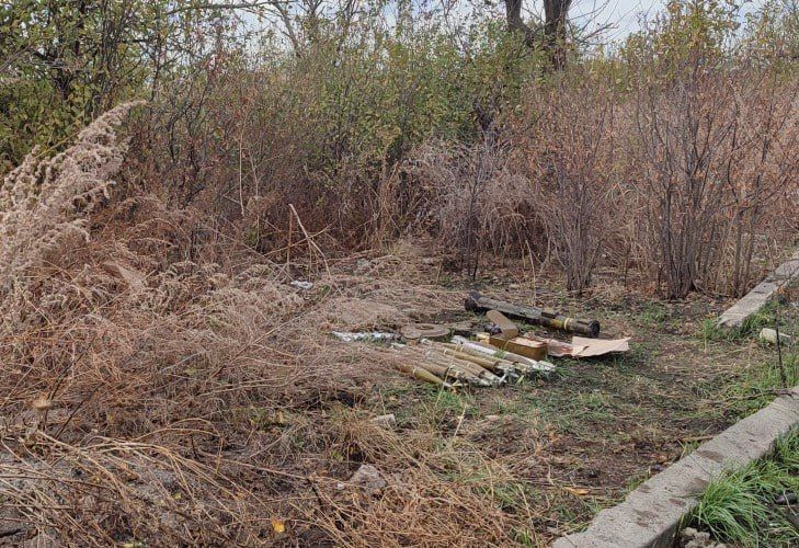 При обследовании схрона обнаружены и изъяты: гранатомет иностранного производства АТ-4, осколочные боеприпасы ВОГ-25, ВОГ-17, более 15 ручных гранат (Ф-1, РДГ-1, РГН-2, РГД-5, Терен-6), 9 запалов УЗРГМ, противопехотные мины МОН-200 и МОН-50, более 10 боеприпасов к противотанковым гранатомётам, 12 мин ТМ-120, мины ТМ-62 и ОЗМ-72, а также порядка 600 патронов калибра 9 и 7,62 мм.