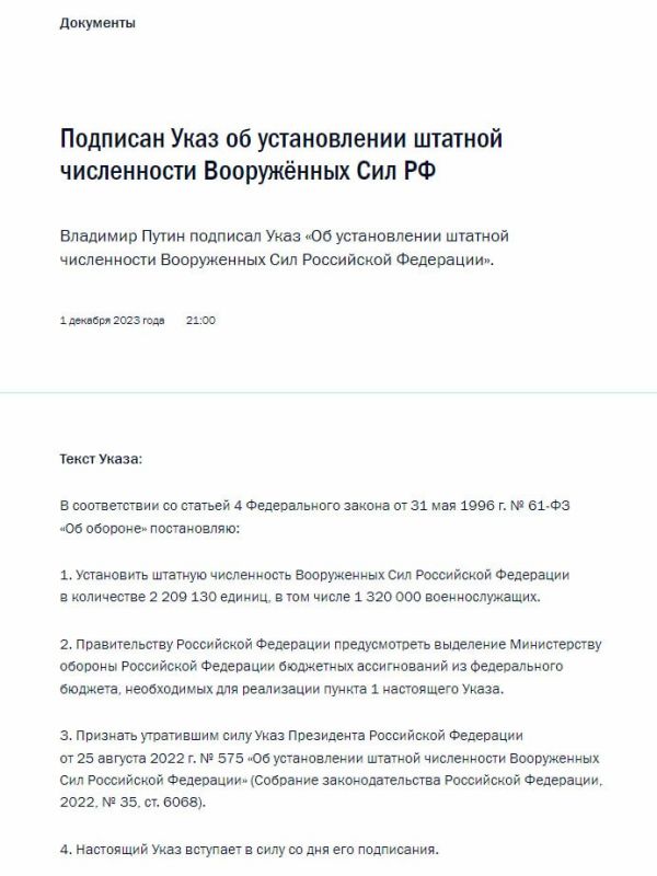 3. Признать утратившим силу Указ Президента Российской Федерации от 25 августа 2022 г. № 575 «Об установлении штатной численности Вооруженных Сил Российской Федерации» (Собрание законодательства Российской Федерации, 2022, № 35, ст. 6068).