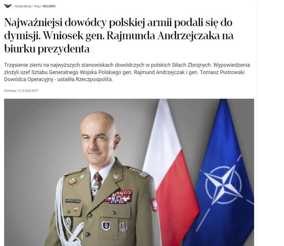 Rzeczpospolita: важнейшие командующие польской армии подали в отставку. Заявления подали начальник Генштаба польской армии, генерал Раймунд Анджейчак и командующий оперативным штабом, генерал Томаш Пиотровский.