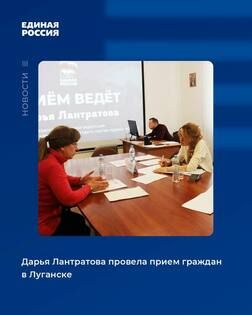 "В Луганске 9 февраля в региональной общественной приемной председателя партии "Единая Россия" Дмитирия Медведева в ЛНР замсекретаря Генсовета "Единой России", сенатор от ЛНР Дарья Лантратова провела личный прием граждан", - говорится в сообщении.