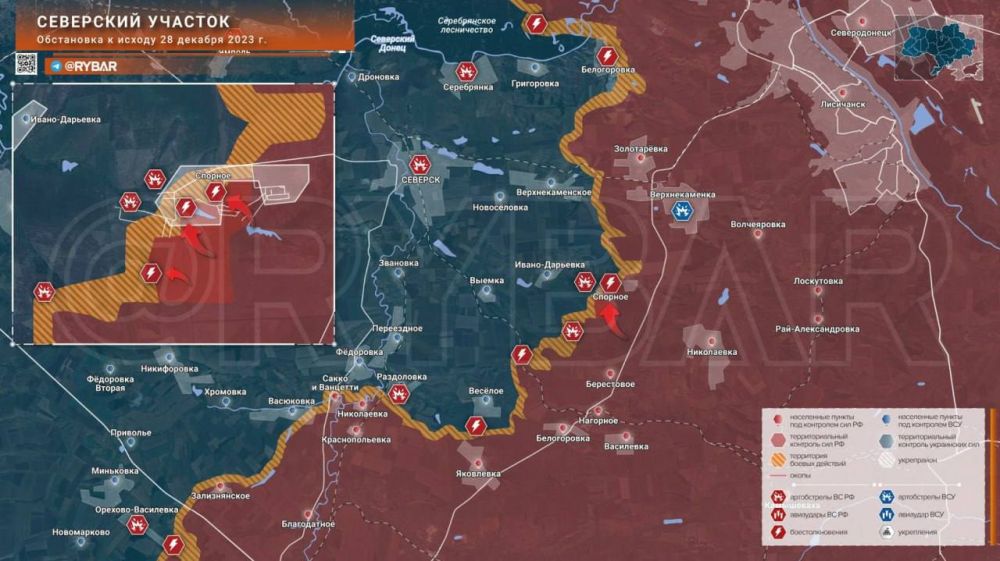 Северское направление: продвижение ВС РФ у Спорногообстановка к исходу 28 декабря 2023 годаДолгое время происходящее под Северском было покрыто «туманом войны»