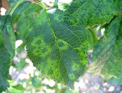 Вирус поражает сливу и другие косточковые плодовые культуры. Симптомы вируса появляются через 9-11 месяцев после заражения. Весной на молодых листьях пораженных растений видны расплывчатые светло-зеленые пятна в виде широких полос и колец. На более крупных листьях окраска пятен бывает желтовато-зеленой, довольно яркой.