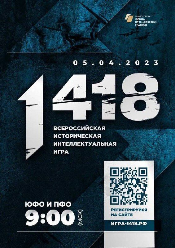 «1418» - онлайн-игра для учащихся образовательных учреждений России в возрасте от 14 до 18 лет. Сыграть и проявить себя может целая команда от 3 до 10 человек. Мероприятие объединяет в себе различные задания, основанные на реальных исторических фактах, воспоминаниях ветеранов и архивных документах времен Великой Отечественной войны.