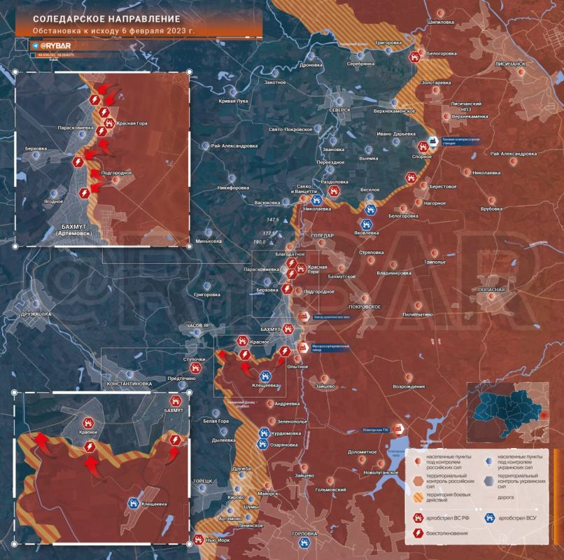 Соледарское направление обстановка к исходу 6 февраля 2023 года На севере от Бахмута в окрестностях Красной горы и Парасковиевки идут активные бои