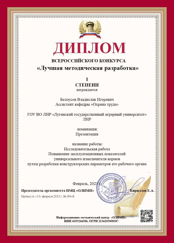 Ассистент кафедры охраны труда Луганского государственного аграрного университета (ЛГАУ) Владислав Белоусов принял участие во Всероссийском конкурсе «Лучшая методическая разработка» и был удостоен звания лауреата 1 степени. Об этом сообщили в пресс-центре ЛГАУ.
