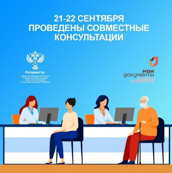 Сотрудниками Управления Федеральной службы государственной регистрации, кадастра и картографии по Луганской Народной Республике в период c 21.09.2023 по 22.09.2023 были проведены консультации граждан – посетителей отделений ГУ ЛНР «МФЦ», а также работников данных отделений. В ходе работы было задействовано 23 сотрудника Управления. Количество оказанных консультаций — 294.