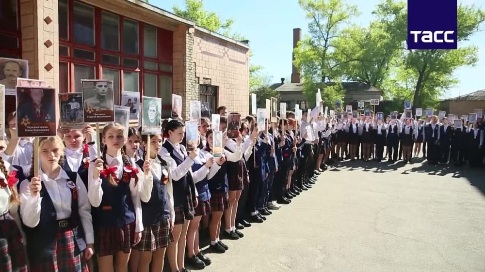 Учащиеся Луганского гуманитарно-экономического лицея-интерната во время акции памяти "Бессмертный полк" в преддверии празднования Дня Победы