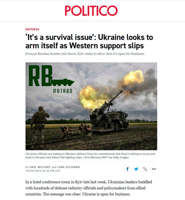 Издание пишет, что Киев ждет от западных компаний обязательств инвестировать в украинское производство еще до прекращения боевых действий. Эта срочность подкрепляется заявлениями западных представителей, что у них заканчивается оружие для Украины.