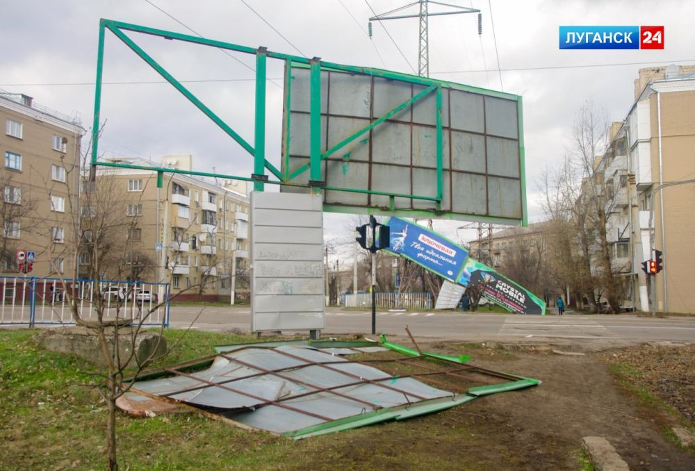 В центре Луганска шквальный ветер повалил два билборда на пересечении улиц Курчатова и 50 лет образования СССР. Не выдержала непогоды и металлическая конструкция рекламного щита рядом со столичным автовокзалом.