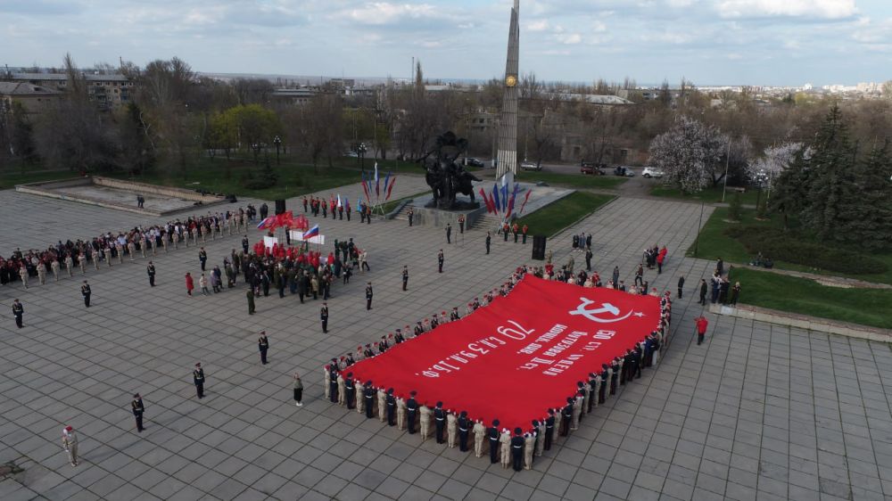 В ходе торжественного митинга участники развернули Знамя Победы площадью 200 кв.м. у памятника Воинам-освободителям в районе луганского автовокзала.