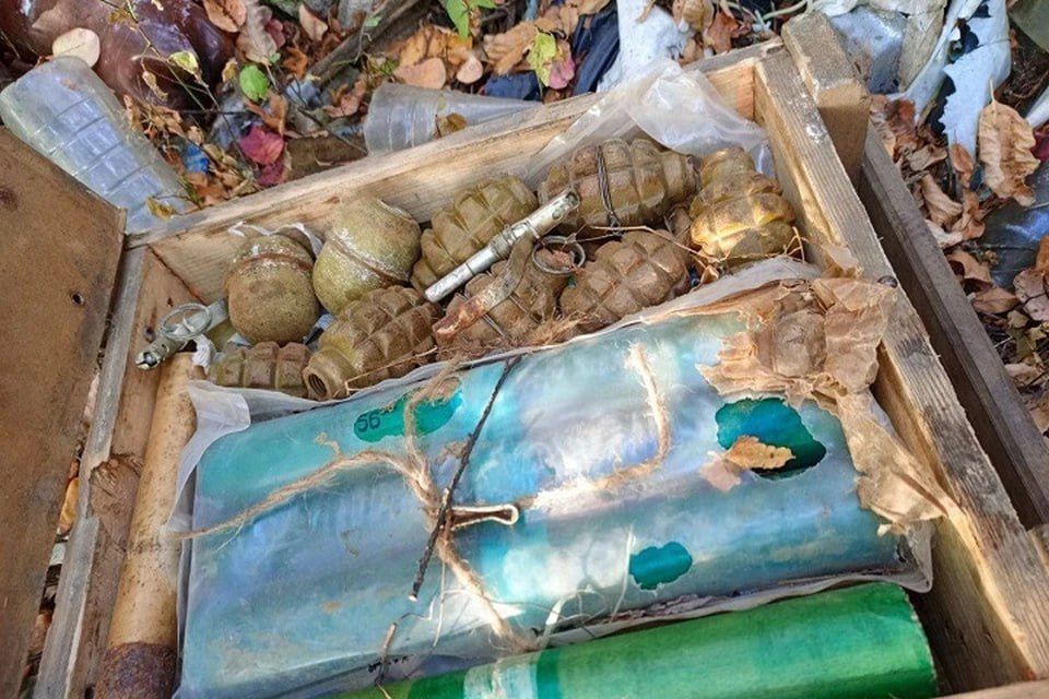 «Так, в районе заброшенного карьера обнаружены автомат АКС-74, магазин к нему и 30 патронов калибра 5,45, а в лесополосе вблизи города — 10 гранат Ф-1, три гранаты РГД-5, четыре взрывателя УЗРГМ-2, девять пороховых зарядов к РПГ-7», — говорится в сообщении.