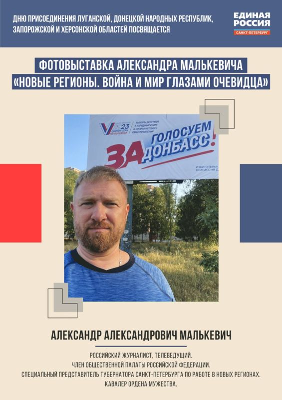 Прошел по этой земле и своими глазами видел происходящее член Общественной палаты РФ, известный российский журналист, коренной ленинградец Александр Малькевич, награжденный за смелость при выполнении профессионального долга в зоне проведения СВО орденом Мужества. Его фотоснимки, представленные в экспозиции, погружают зрителя в новую реальность Донбасса, от прифронтовой жизни до сегодняшних будней мирного строительства.