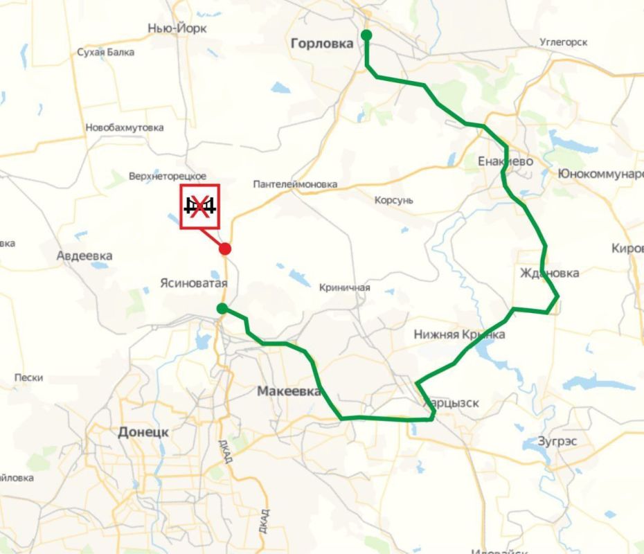 через г. Макеевку по автодороге "Донецк – Макеевка – Торез – до границы ЛНР", далее через г. Харцызск до автодороги "Енакиево – Харцызск", далее через г. Енакиево, съезд на автодорогу федерального значения Р-150 и далее в сторону Горловки.