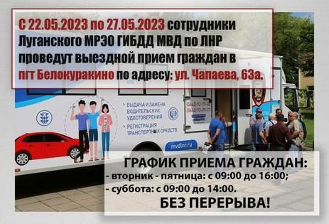 Выездной пункт Луганского межрайонного регистрационно-экзаменационного отдела (МРЭО) ГИБДД МВД по ЛНР будет работать в поселке городского типа (пгт) Белокуракино с 22 по 27 мая