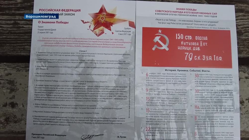Знамя Победы развевается на территории ГТРК ЛНРНапомним, что ранее оно было передано сотрудникам телеканала «Луганск 24» пресс-службой Росгвардии в честь референдума о присоединении Луганской Народной