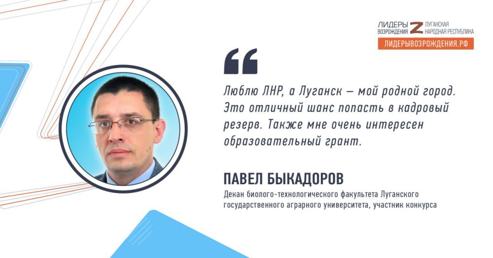 Декан биолого-технологического факультета Луганского государственного аграрного университета Павел Быкадоров рассказал о своих ожиданиях по поводу очного этапа кадрового конкурса «Лидеры возрождения. Луганская Народная Республика»: «О конкурсе я услышал по радио, также нам пришло письмо, правда уже после того, как я прошел регистрацию. Заинтересовало, захотел попробовать свои силы, тем более я люблю ЛНР, а Луганск – мой родной город. Это отличный шанс попасть в кадровый резерв. Также мне очень интересен образовательный грант».